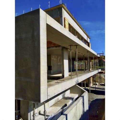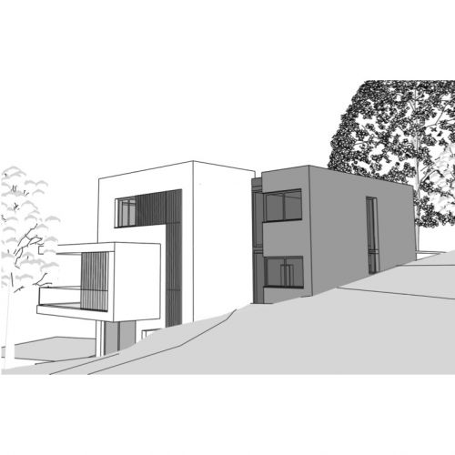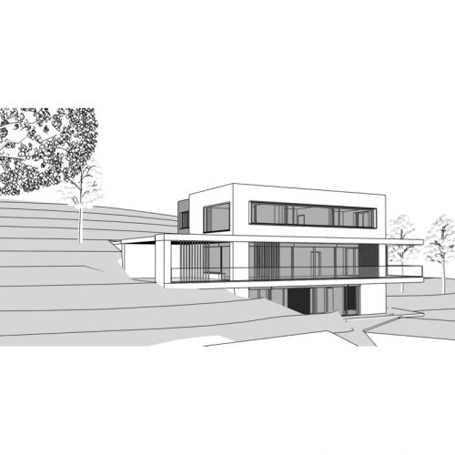 Das Einfamilienhaus mit Einliegerwohnung wurde in schwieriger Hanglage geplant und umgesetzt. Ein auskragender Balkon prägt die klare, moderne Form und schafft gleichzeitig einen geschützten Außenraum im Erdgeschoss. Große Fensterflächen ermöglichen weite Ausblicke und helle Wohnräume.